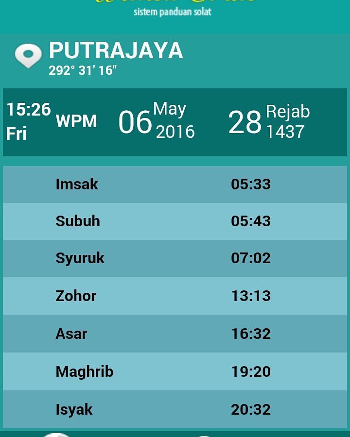 Assalamualaiukm ya sokhib malaysia semua, kali ini kami akan maklumkan jadual dan waktu solat. Alert waktu solat fardhu bagi kawasan wilayah persekutuan kuala lumpur. Terima notifikasi waktu solat terus ke telefon bimbit / komputer anda? Cetakan waktu solat dibenarkan sama ada dalam bentuk taqwim miladi atau taqwim hijri. Alert waktu solat fardhu bagi kawasan wilayah persekutuan kuala lumpur.
