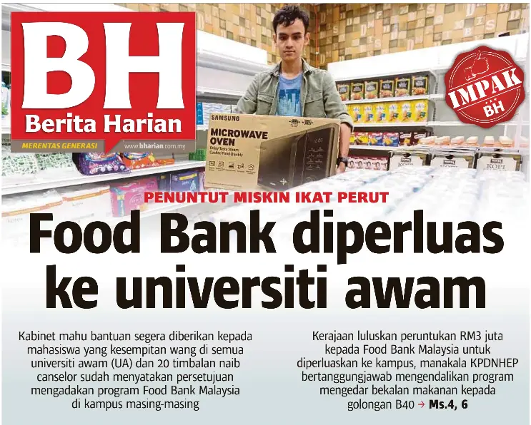 Program food bank siswa telah memberi manfaat kepada 6,870 pelajar kurang mampu di 21 universiti awam sejak ia dimulakan pada februari 2019. Program food bank malaysia adalah berpaksikan kepada empat (4) objektif utama iaitu inisiatif peduli rakyat, meningkatkan kesedaran pengguna, pengurusan lebihan makanan yang lebih sistematik dan membantu industri peruncitan di malaysia.justeru, kementerian perdagangan dalam negeri dan hal ehwal pengguna akan menjadi agensi peneraju bagi pelaksanaan program ini. (2m) membasmi masalah kelaparan golongan miskin. Kementerian kewangan meluluskan dana rm3 juta kepada program food bank malaysia untuk menyediakan 14 lori dilengkapi pendingin. Mahathir menyasarkan pengagihan semula makanan kepada mereka yang memerlukan bagi mengurangkan kos hidup, terutamanya mereka yang berada di dalam kumpulan b40.